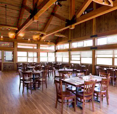 Our spacious dining hall offers a cozy atmosphere, perfect for enjoying a hearty meal with family and friends.